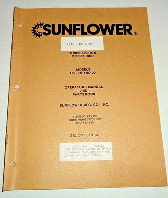Sunflower 1331 Model H3 18 20 Offset Disc Operators Parts Manual Catalog Book Ebay